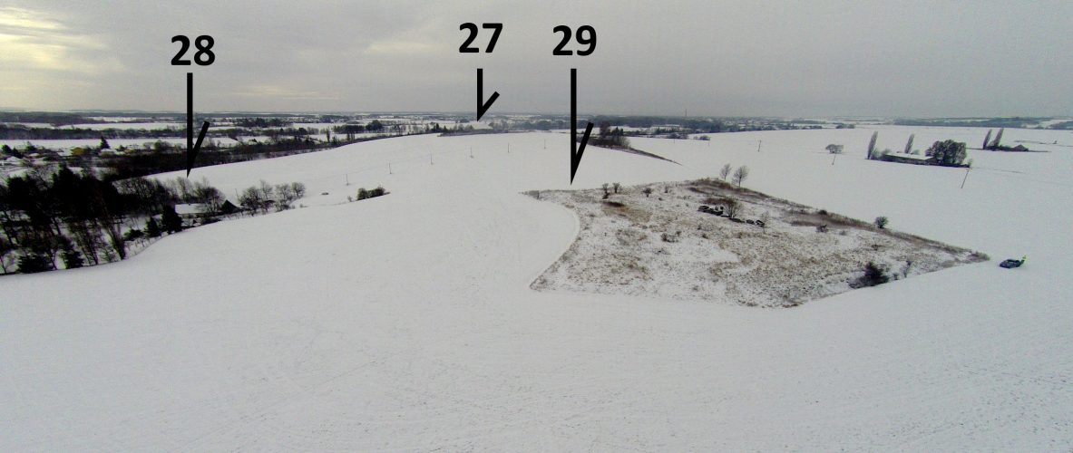 Letecký snímek objektu č. 29 (biret), k. ú. Dolní Dolce. Opevnění z války o bavorské dědictví bylo ve svém týlu doplněno a uzavřeno příkopem v souvislosti s budováním jedné z pracháren josefovské pevnosti. Část půdorysu biretu je dobře patrná ve východní části objektu (na snímku levá část objektu). Šipkami označeny sousední objekty 28 (redan, nedochovaný) a 27 (reduta, dochována).