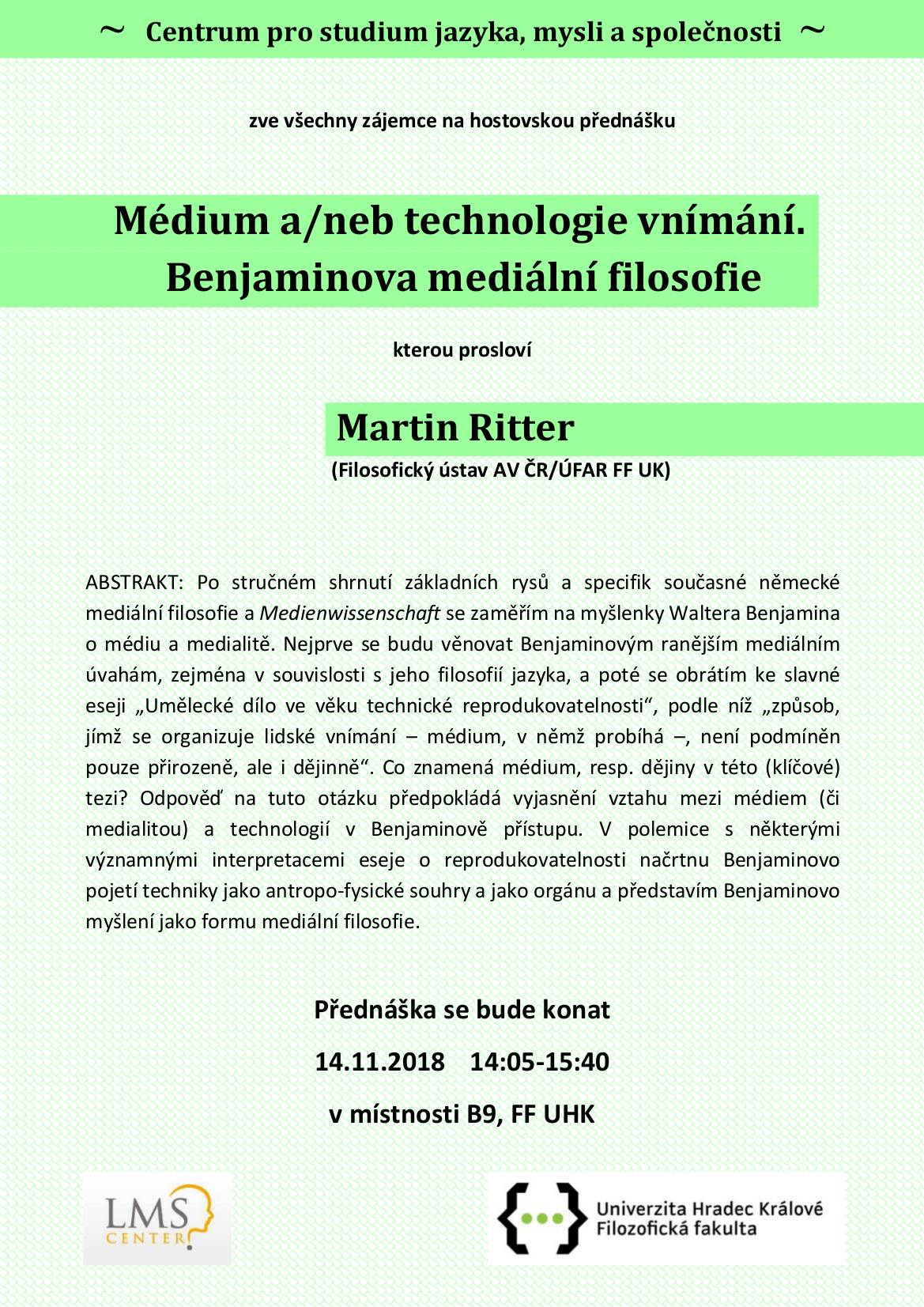 ABSTRAKT: Po stručném shrnutí základních rysů a specifik současné německé mediální filosofie a Medienwissenschaft se zaměřím na myšlenky Waltera Benjamina o médiu a medialitě. Nejprve se budu věnovat Benjaminovým ranějším mediálním úvahám, zejména v souvislosti s jeho filosofií jazyka, a poté se obrátím ke slavné eseji „Umělecké dílo ve věku technické reprodukovatelnosti“, podle níž „způsob, jímž se organizuje lidské vnímání – médium, v němž probíhá –, není podmíněn pouze přirozeně, ale i dějinně“. Co znamená médium, resp. dějiny v této (klíčové) tezi? Odpověď na tuto otázku předpokládá vyjasnění vztahu mezi médiem (či medialitou) a technologií v Benjaminově přístupu. V polemice s některými významnými interpretacemi eseje o reprodukovatelnosti načrtnu Benjaminovo pojetí techniky jako antropo-fysické souhry a jako orgánu a představím Benjaminovo myšlení jako formu mediální filosofie.